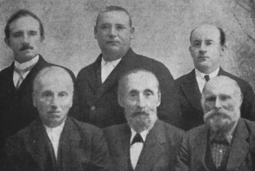 Buksnes Sparebanks styre og kasserer omkring 1930. Sittende fra venstre: Petter Bjørnsen, nestformann, Jak. A. Pedersen, formann, Jacob Bjørkås. Stående fra venstre: Otto Rinnan, Leonhard H. Skotnes, og kasserer Birger Holm.