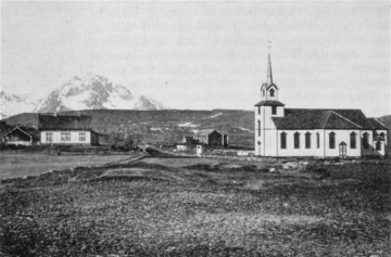 Buksnes gamle kirke. Til venstre den gamle prestegård.