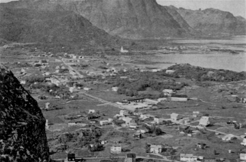 I forgrunnen Svarholt gård. I bakgrunnen Kangeruren. Stamsund kirke midt